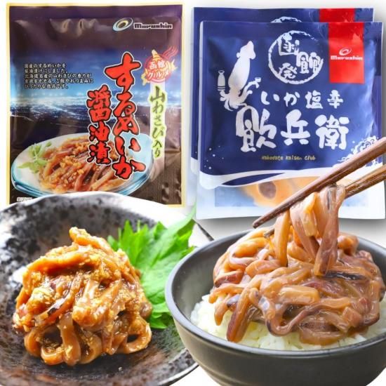 原材料 塩辛:いか(国産)、いか肝臓、食塩、還元水あめ、米発酵調味料、砂糖、こうじ調味液、唐辛子/ソルビット、調味料(アミノ酸等)、pH調整剤、酒精、増粘多糖類、(一部にいかを含む)                          醤油漬け:するめいか(国産) 、わさび大根 醤油 米発酵調味料 砂糖 還元水飴 かつおぶし 食塩 酵母エキス 調味料(アミノ酸等) 増粘多糖類 酒精 (原料の一部に小麦、大豆を含む)